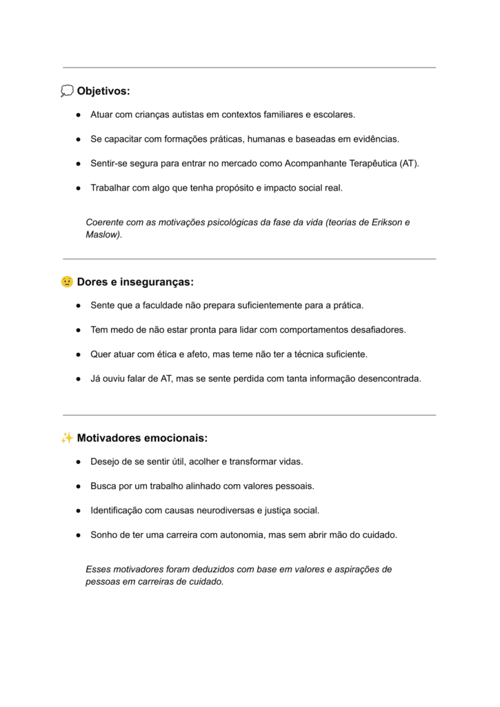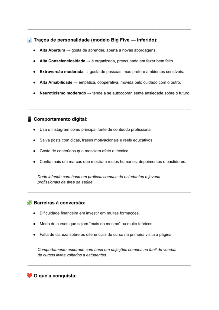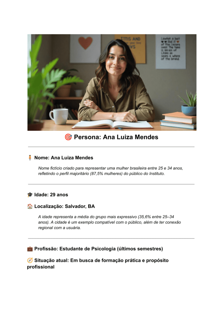 Com base em dados das primeiras turmas captados com formulários de inscrição e insights do Instagram, criamos a persona “Ana Luiza Mendes”, representando uma mulher jovem, estudante de Psicologia, buscando formação prática e alinhada com valores humanistas.